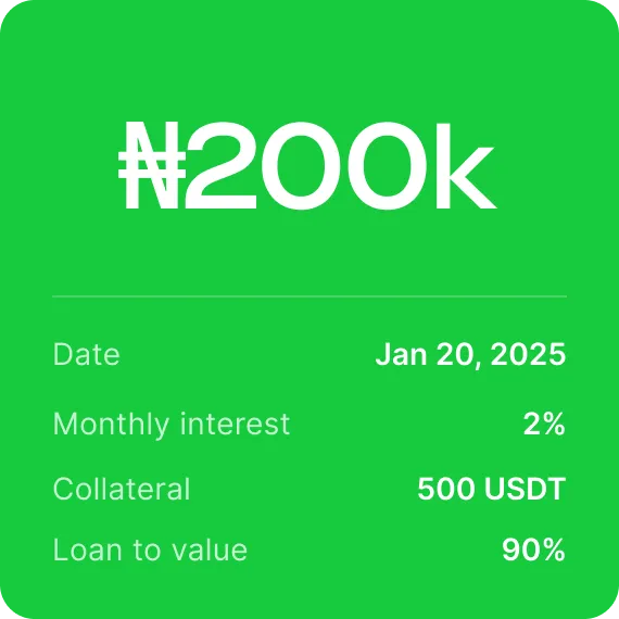 Use your crypto or USD savings as collateral to get instant Naira loans, keep your holdings, and benefit if they go up in value.