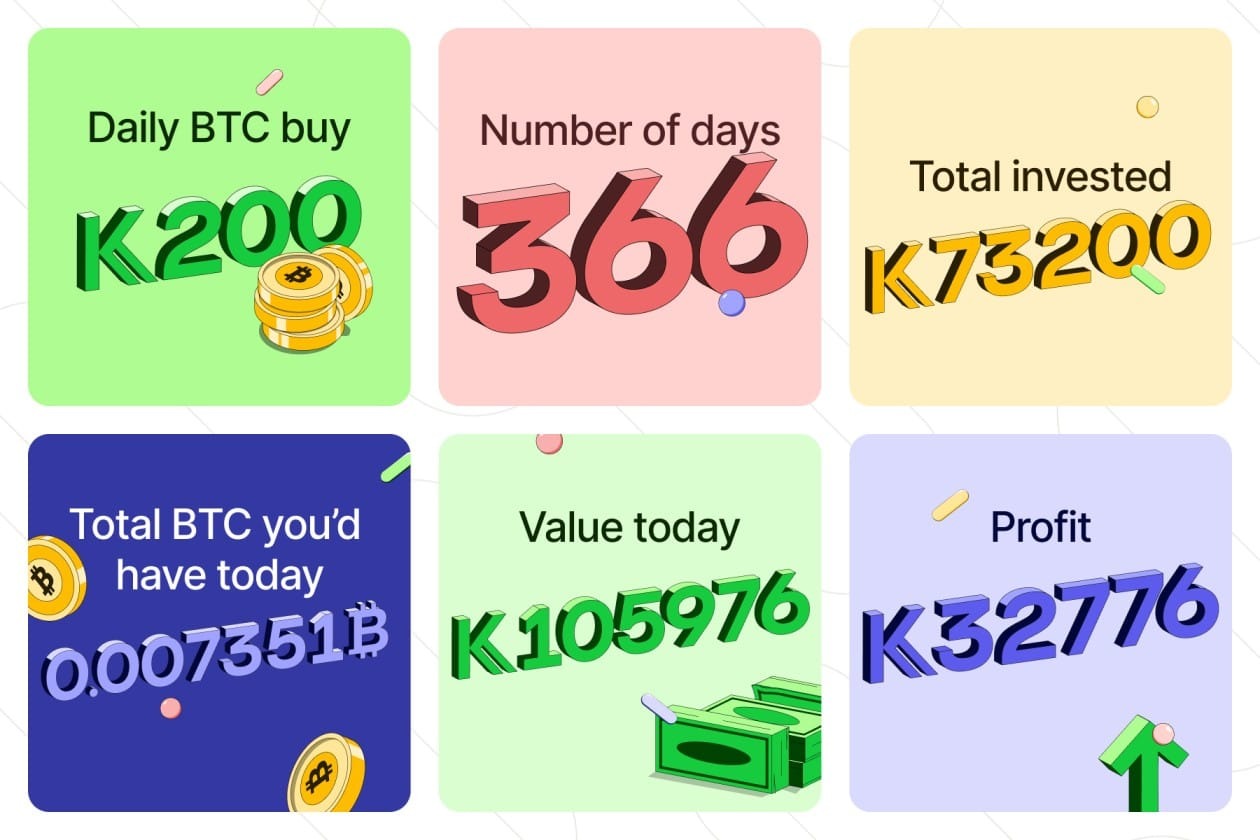 If you had used the Recurring Buy feature on the Busha app to buy KES 200 worth of Bitcoin every day for the past year (that’s 366 days), you would have spent a total of KES 73,200