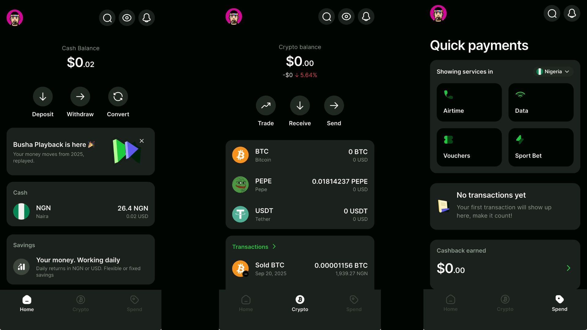 Now, the app is organised into three clear areas. Home shows your cash balances and savings in one place. Crypto shows your digital assets. Spend covers things like airtime, data, vouchers, and betting.